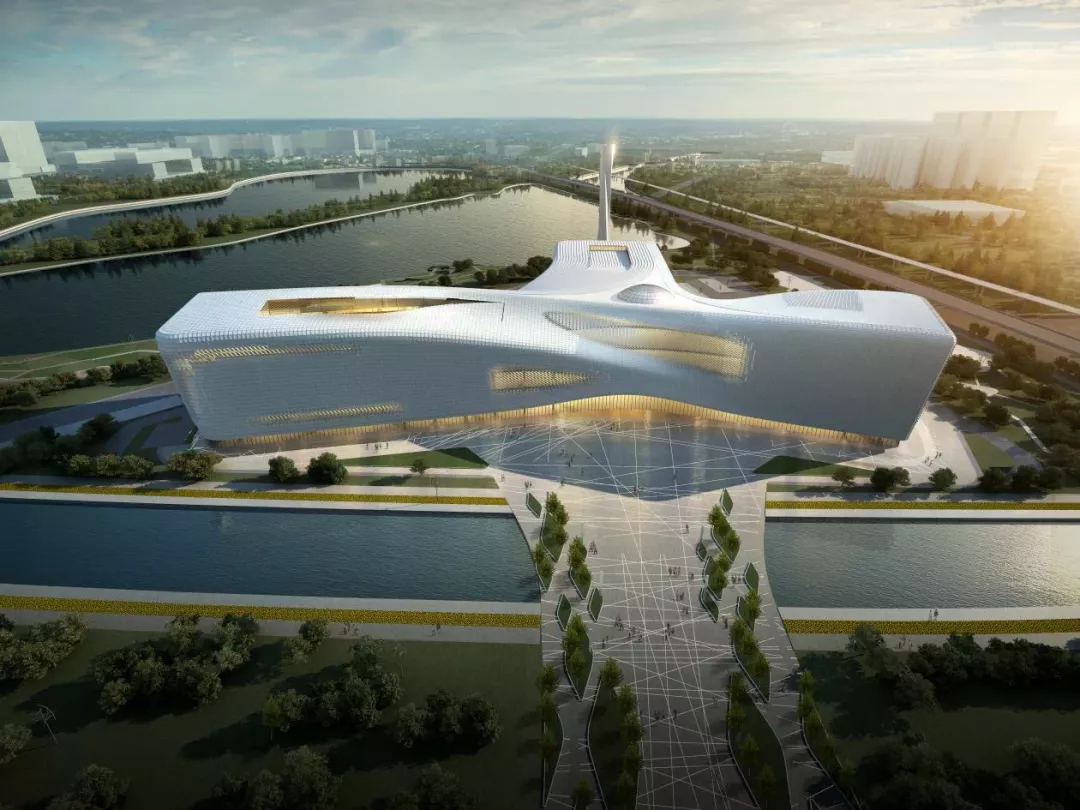 科技馆主场馆建筑形态奇特,宛如螺旋桨引擎和飞鸟展翼,建筑本身被当作一个“高科技展品”来设计,强烈的科技感寓意着“郑州腾飞、河南崛起”。其钢结构用钢量设计值达1.5万吨,空间扭转双层幕墙面积约合10万平方米。